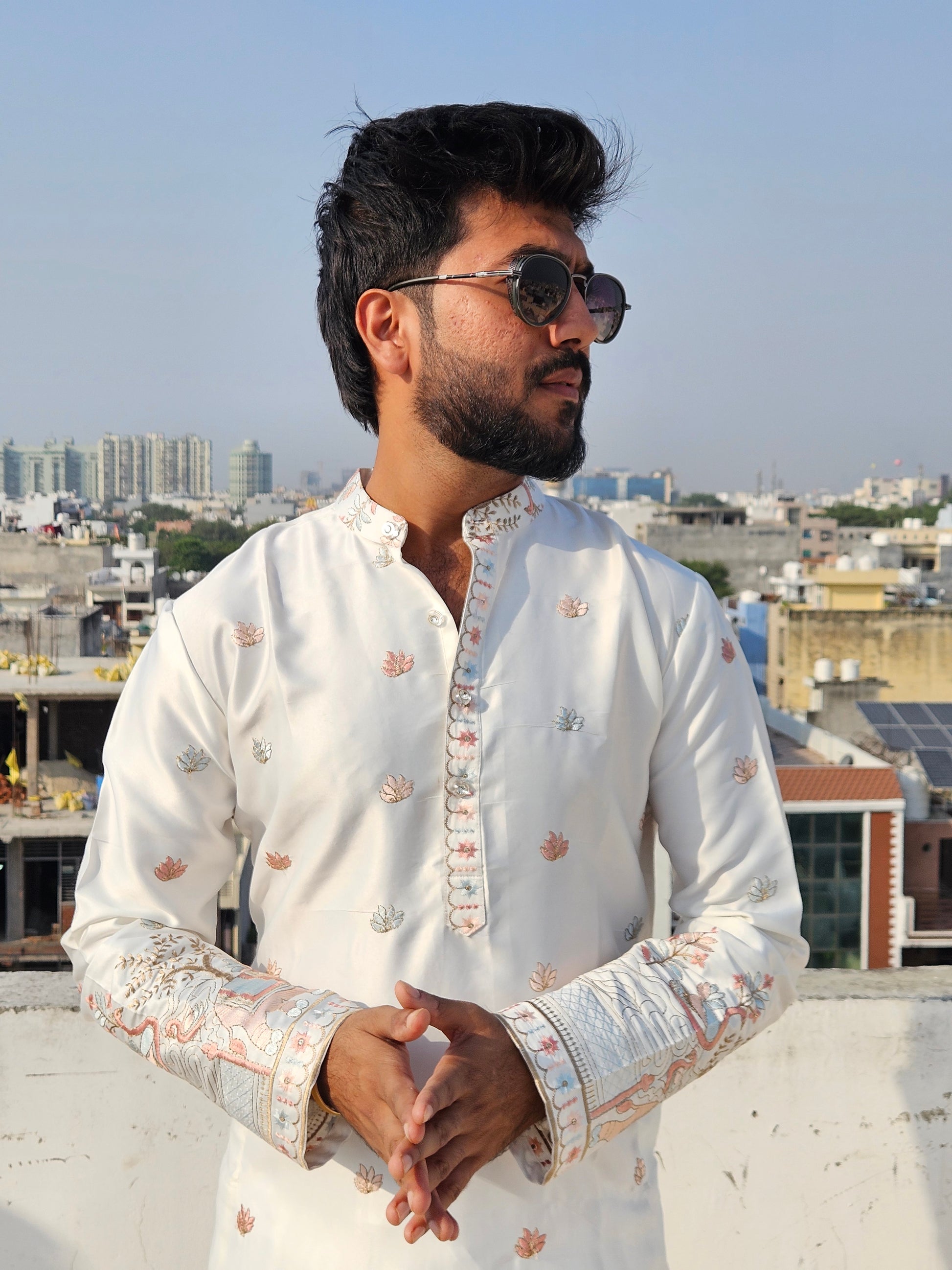Step into celebration with effortless grace in this White Malai Silk Embroidered Kurta, a timeless piece designed to make you shine. Adorned with delicate mirror work and tailored for comfort, it brings together the richness of tradition and the finesse of modern design. Whether it’s a wedding, festive gathering, or a moment worth remembering, this kurta ensures you arrive with unmistakable elegance.